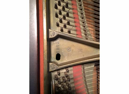 Here's a picture of the cast plate with the piano model number (M) and the serial number. The first 2 digits designate the year of manufacture. Although the number looks like it might say 21, in person you can see it is a 24, which is for the year 1926. I felt a little weird putting the whole serial number out on the internet, so I blocked off the last 2 numbers. You can see how dirty & dusty & rusty the strings and pins are.